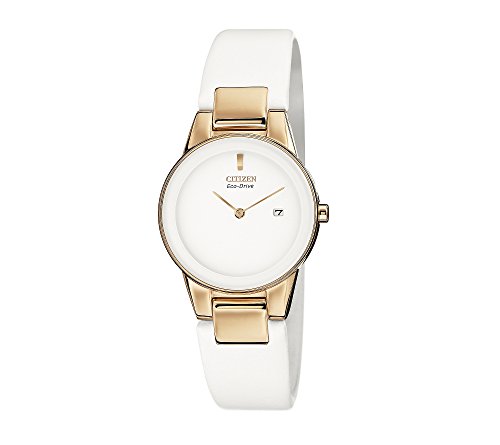 Look fine and fashionable from day to night with the Citizen Women’s Eco-Drive Stainless Steel Axiom Strap Watch. Sleek and refined, this womens watch features a white leather strap for seriously chic style. A round, white dial with edge-to-edge glass and rose goldtone accents completes the sophisticated look of this charming womens watch.