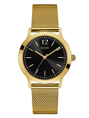 Black dial features gold-tone hands and hour markers, minute track, and Guess detailing.