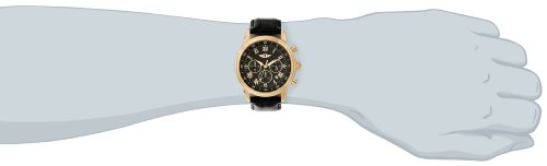 Classic chronograph styling with refined, contemporary features, the I by Invicta Men’s Chronograph Black Dial Black Leather Watch boasts a textured leather band that closes with a traditional buckle and an oversized 18k gold-plated stainless steel case. This case provides the setting for the watch’s attractive black dial, which sports gold-toned Roman numeral hour markers and luminous gold-toned hands. The dial also features three subdials at the three, six, and nine o’clock positions and a date window near the four o’clock position. Additionally, the entire dial is protected by a genuine mineral crystal. Other features include two large buttons that flank the watch’s textured crown, water-resistance to 165 feet (50 meters), and Japanese quartz movement.
