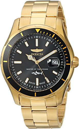 Yellow gold-plated stainless steel case and bracelet. Uni-directional rotating yellow gold=plated bezel with a black top ring. Black dial with luminous yellow gold-tone hands and index hour markers. Minute markers around the outer rim. Dial Type: Analog. Luminescent hands and markers. Date display at the 3 o’clock position. Ronda caliber 515 quartz movement. Scratch resistant flame fusion crystal. Pull / push crown. Solid case back. Round case shape. Case size: 44 mm. Case thickness: 14 mm. Band width: 20 mm. Band length: 8.5 inches. Fold over clasp with a safety release. Water resistant at 100 meters / 330 feet. Functions: date, hour, minute, second. Casual watch style. Watch label: Swiss Made. Invicta Pro Diver Master of the Oceans Black Dial Mens Watch 25810.