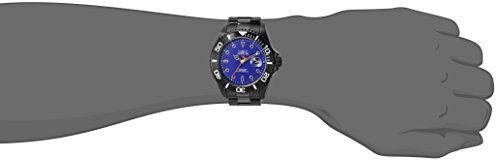 Blue dial with silver tone, red and black hands and silver tone and black hour markers; luminous; unidirectional bezel; flame fusion crystal; black ion-plated stainless steel case and bracelet