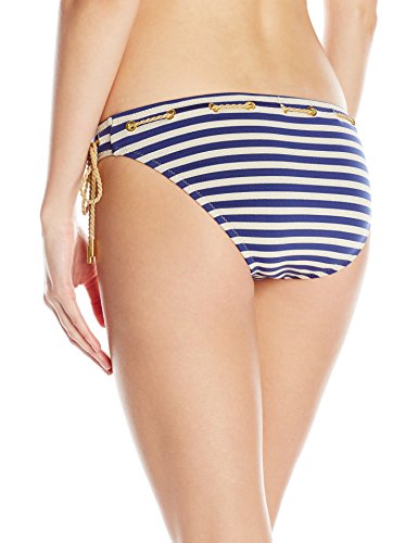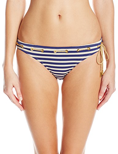 Striped nautical bikini bottom featuring slotted rope lacing with gold-tone grommets