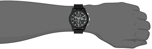 Stainless steel case back. Silicone wrapped case. Silicone strap with adjustable buckle closure. Round face. Three-hand analog display with quartz movement. Dial features white-tone hands and hour markers, Lacoste detailing, and three subdials. Water resistant, 5 ATM.