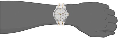 Gents Tommy Hilfiger watch collection. Stainless steel case. Silver and gold stainless link bracelet. White texture dial. Case size: 44 mm. Date display. Scratch resistant: mineral crystal. Water resistant: 50 meters /165 feet. Movement: Quartz. Comes with original box and booklet. Warranty: 10 Years.