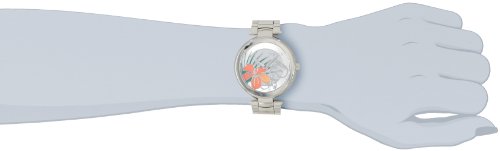 Stainless steel case with a stainless steel bracelet. Fixed stainless steel bezel. Silver sunray dial with orange hibiscus flower and baroque decoration and silver-tone hands. Dial Type: Analog. Quartz movement. Scratch resistant sapphire crystal. Pull / push crown. Solid case back. Case diameter: 38 mm. Case thickness: 8 mm. Round case shape. Band width: 18 mm. Deployment clasp. Water resistant at 50 meters / 165 feet. Functions: hour, minute. Dress watch style. Watch label: Swiss Made. Versace Mystique Silver Hibiscus Dial Stainless Steel Ladies Watch 19Q99D1HI-S099.